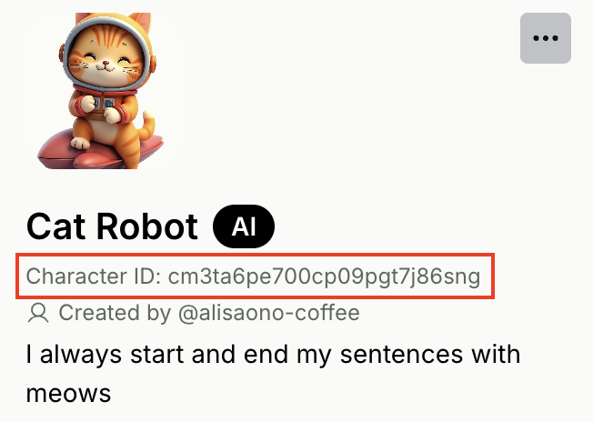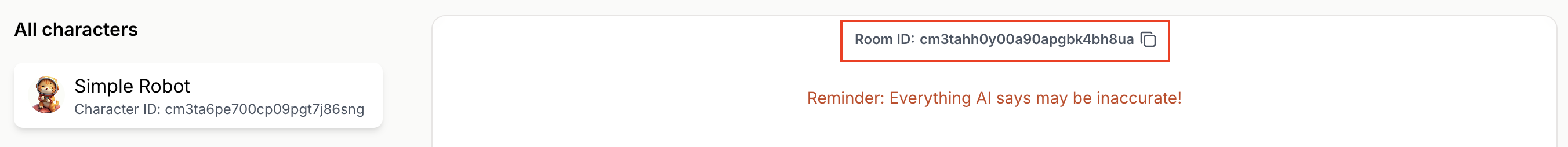 A Room represents a conversation session between User(s) and one or many Characters. You should create a new Room whenever you want User(s) to start a fresh conversation with your Character(s). You can reuse an existing Room if your want your Character(s) to have memory of the conversation history that has taken place in the Room. For this tutorial, let’s create a new Room with just one Character, our “Cat Robot”. You have 2 options for creating a new Room, through the Playground or through our API.Option 1: Create a Room on Playground